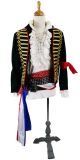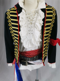 Outfit consists Of: Black braided jacket, stripey trousers(not in photo), studded belt, coloured sash and french revolutionary flag sash, white frilly fronted shirt and knee high boots(optional).