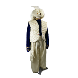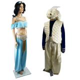 A classic animated 90s character costume consisting of padded turban, blue velvet long sleeved top, quilted waistcoat, matching baggy trousers elasticated on waist and ankle and matching waist sash.